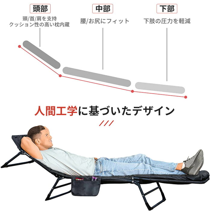 折りたたみベッド ポータブルベッド 簡易ベッド 介護用ベッド リクライニングチェア 昼寝椅子 シングル 折りたたみチェア アウトドア キャンピング 調整可能 軽量 組み立て簡単 ポータブル 室内 耐荷重150kg 【快適な眠り】寝心地と静音性にトコトンこだわった高反発折り畳み式ベッドで、人間工学に基づいた設計や立体充填技術によって体にフィットし、高品質のポリエステル生地に3cm圧縮スポンジに加えて、昼寝でも充分快適な睡眠を楽しめます。