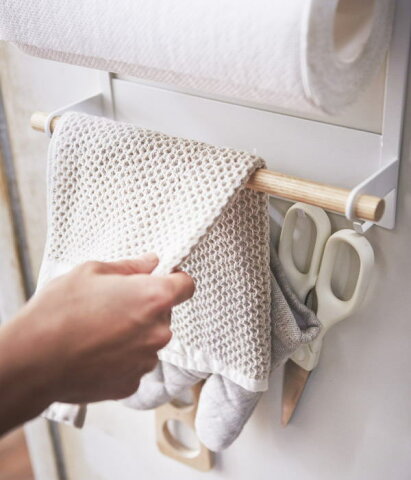 ・ カラー / ホワイト・ 製品サイズ / 約 幅 27.5 × 奥行 7.5 × 高さ 34 cm・ 上段ホルダー内寸 / 約 幅 24 × 奥行 5.5 × 高さ 12.5 cm・ キッチンペーパー対応サイズ / 約 直径 11 × 高さ 24 cm以内・ 材質 / 本体 : スチール(粉体塗装) バー : 天然木 ストッパー : シリコーン樹脂・ 重量 / 約 870g・ 耐荷重 / 約 4kg・ 生産国 / 中国・ 付属品 / マグネット・ 冷蔵庫横に収納スペースを。