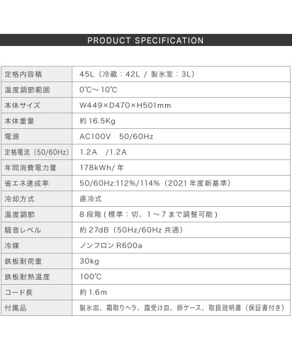 温度調節範囲:0℃〜10℃本体サイズ:W449×D470×H501mm本体重量:約16.5Kg電源:AC100V 50/60Hz定格電流(50/60Hz):1.2A /1.2A年間消費電力量:178kWh/年省エネ達成率:50/60Hz:112%/114%(2021年度新基準)冷却方式:直冷式温度調節:8段階(標準:切、1〜7まで調整可能)騒音レベル:約27dB(50Hz/60Hz共通)冷媒:ノンフロンR600a鉄板耐荷重:30kg鉄板耐熱温度:約100℃コード長:約1.6m付属品:製氷皿、霜取りヘラ、露受け皿、卵ケース、取扱説明書(保証書付き)-----------------------------梱包サイズ:W460×D500×H530mm梱包重量:約18Kg入数:1台-----------------------------【商品変更日】2021年9月1日【変更箇所】・定格内容積:46L→45L・霜取り機能追加・JAN型番変更【送料について】北海道、沖縄、離島は別途送料を頂きます。