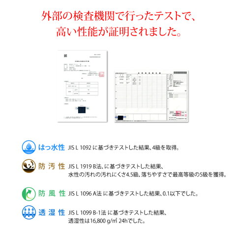 一般財団法人 ボーケン品質評価機構にてJIS L 1092(スプレー法)に基づき試験を行った結果、はっ水度は4級でした。