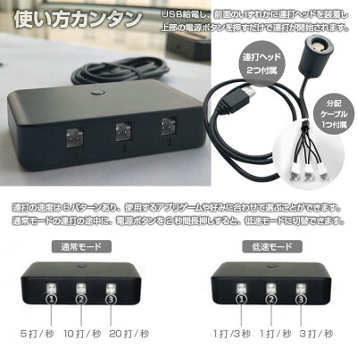 スマホゲームのお供に最適! ● USB給電し、前面のいずれかに連打ヘッドを装着し、上部の電源ボタンを押すだけで連打が開始されます。