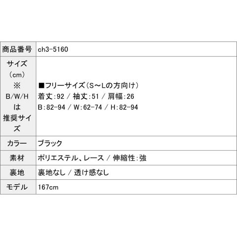 商品番号ch3-5160 サイズ(cm)※B/W/Hは推奨サイズ■フリーサイズ(S〜Lの方向け)着丈:92 / 袖丈:51 / 肩幅:26 / B:82-94 / W:62-74 / H:82-94 カラーブラック 素材 / 伸縮性ポリエステル、レース / 伸縮性:強 裏地 / 透け感裏地なし / 透け感なし モデル身長167cm / M着 詳細非常におしゃれで清楚端麗な容姿の、ミディアム膝丈ニットワンピースです。