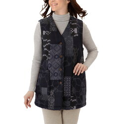 ※日本製 和柄裏ボア暖かベスト 黒系 トップス ベスト レディース 婦人 ミセス シニア 和風柄 あったか 防寒 ブラック 着物風模様 ちょっと寒い日にサッと羽織れるロング丈の裏ボアベストです。